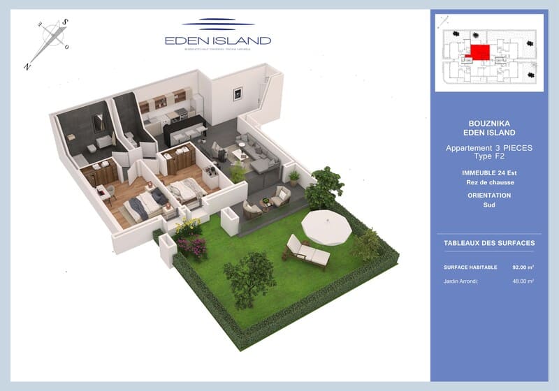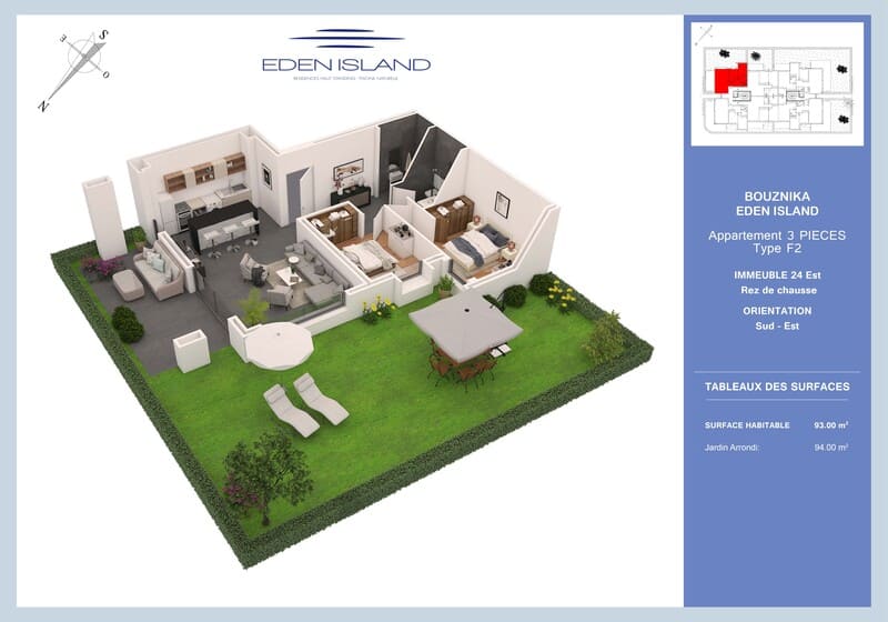 Les immeubles ont été disposés de façon à avoir moins de vis à vis que dans la 1ère tranche du projet. En effet ils sont espacés de 18m et enfin 80% des appartements ont vue sur la zone de loisirs ou sur l’extérieur du projet (mer). Les cuisines américaines sont entièrement équipées.
